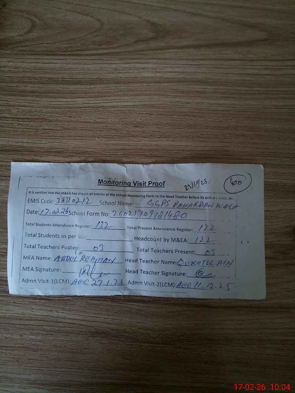 | Attendance Register | Head Teacher | MEA with School | Visit Proof |