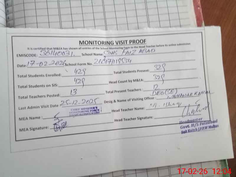 | EMIS Code: 36140031 | Name of School: GHS FAIZ ABAD P/O BAIT KATCH | |||