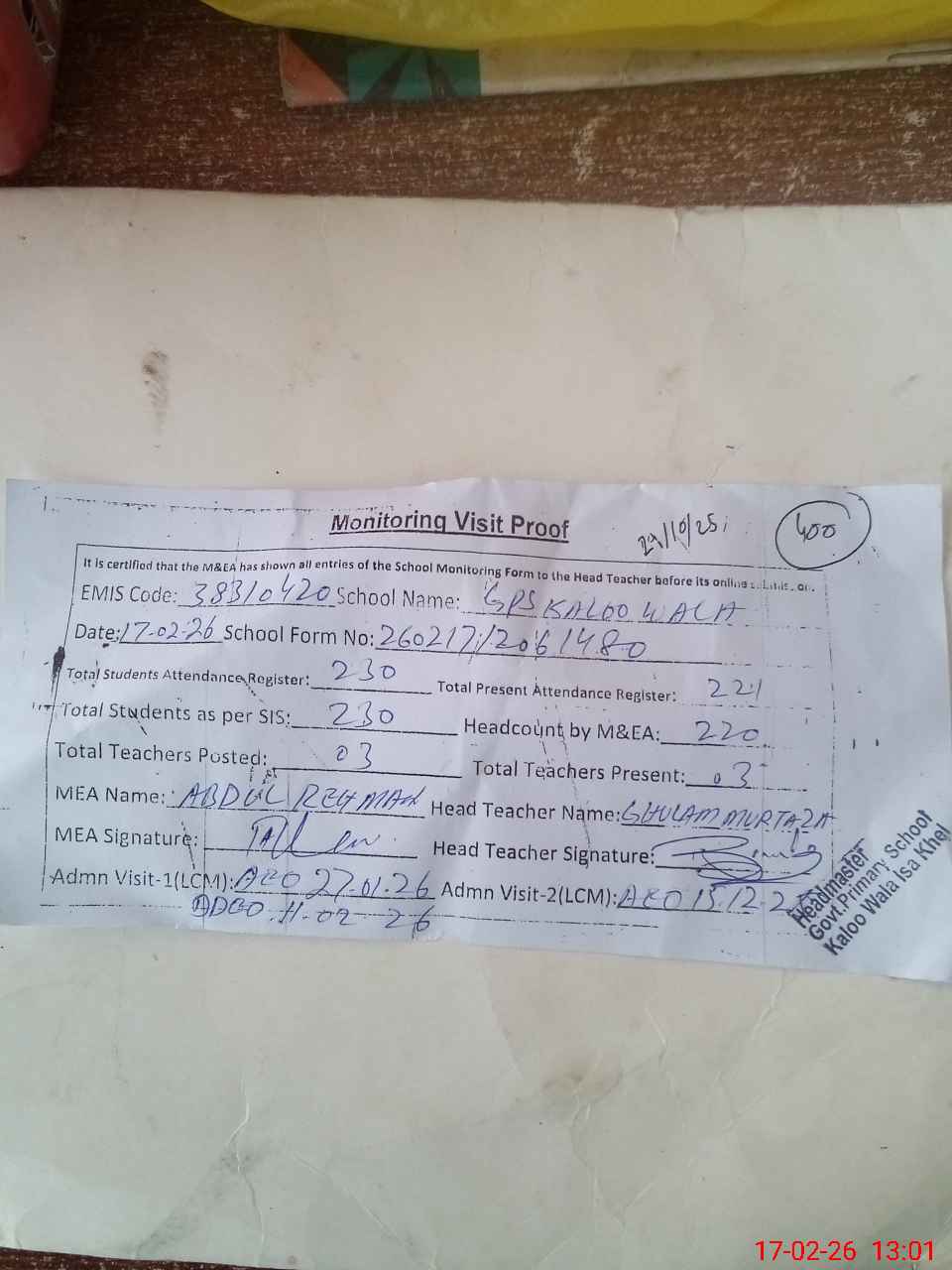 | EMIS Code: 38310420 | Name of School: GPS KALOO WALA | |||