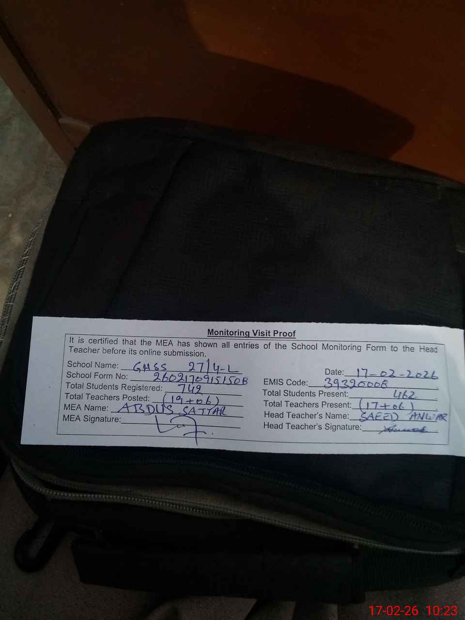 | Attendance Register | Head Teacher | MEA with School | Visit Proof |