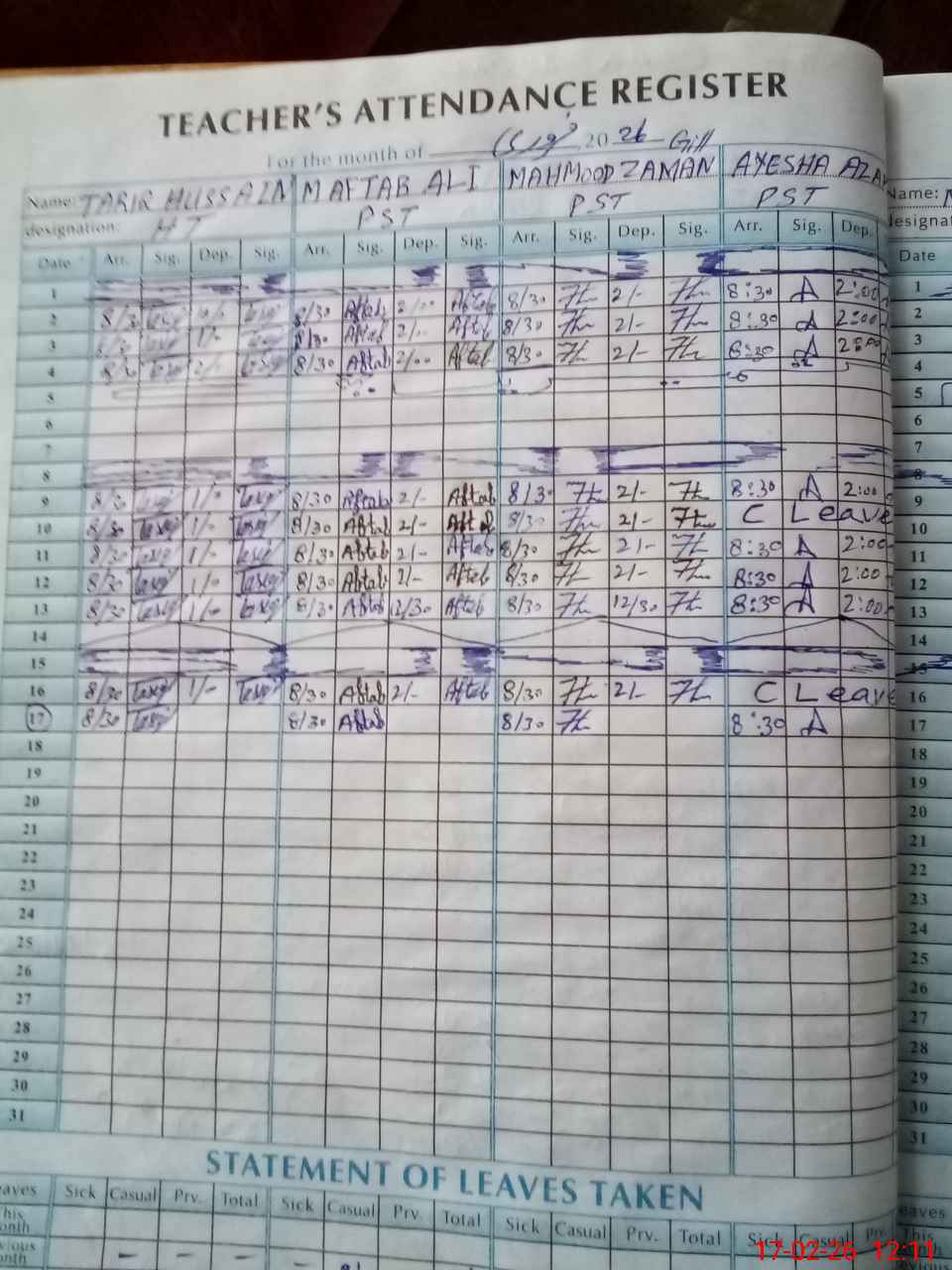 | CNIC | Full Name | Designation | R/C | Absence During Last Calender Month |