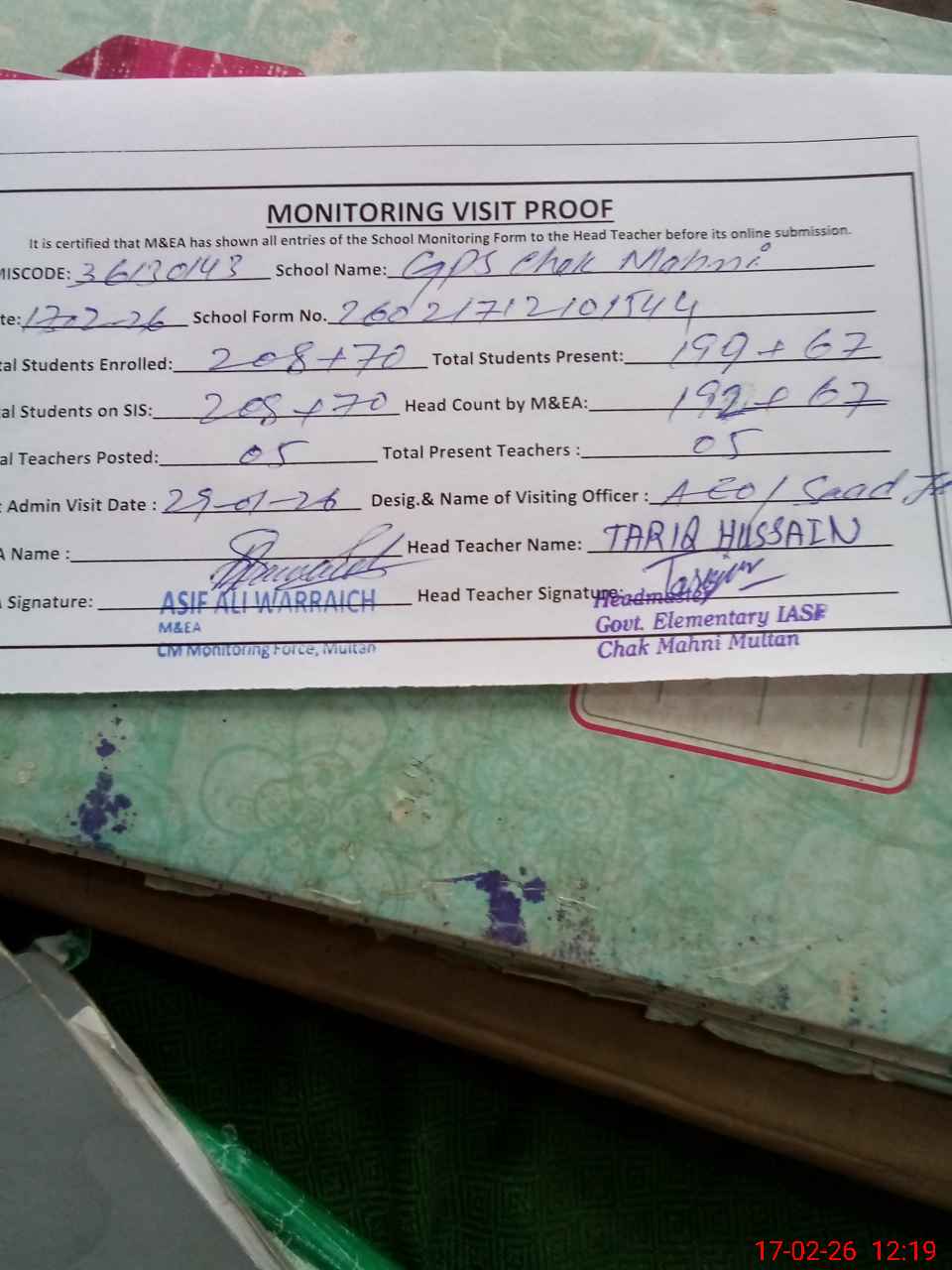 | Attendance Register | Head Teacher | MEA with School | Visit Proof |