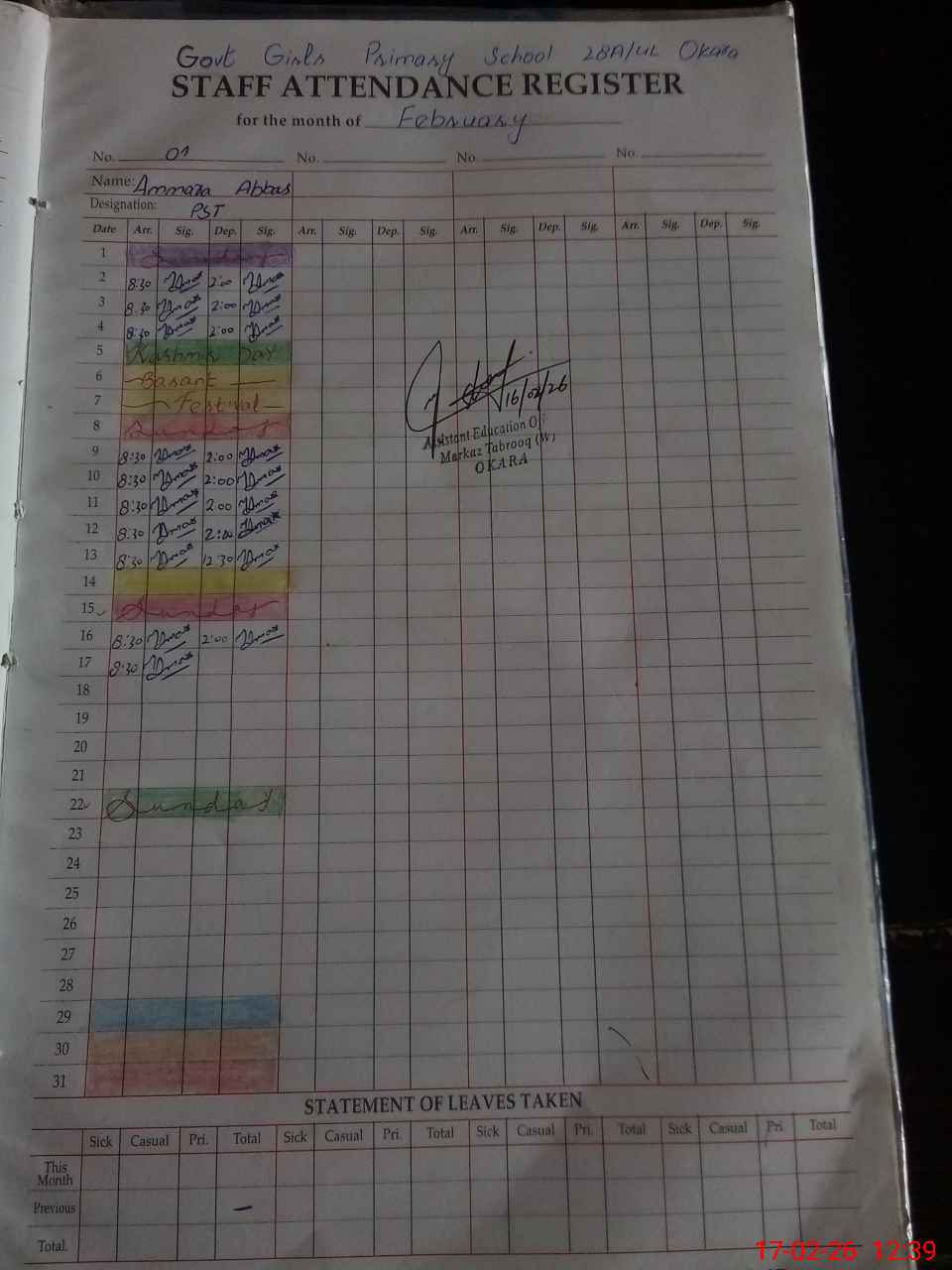 | District: OKARA | Tehsil: OKARA | Markaz: TABROOQ - FEMALE | Level: Primary | |