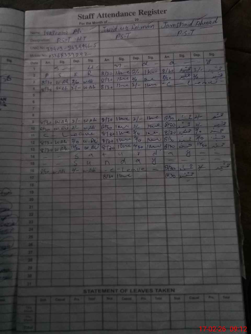 | Name: Wa**** Al**** Designation: (School Headmaster's/Headmistress's) PST Phone/Cell Number: 03**** |