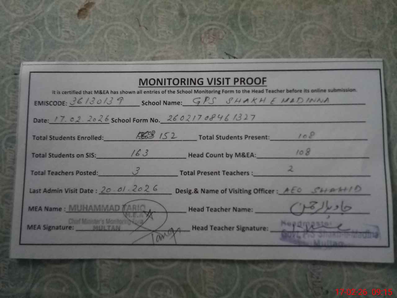 | Attendance Register | Head Teacher | MEA with School | Visit Proof |