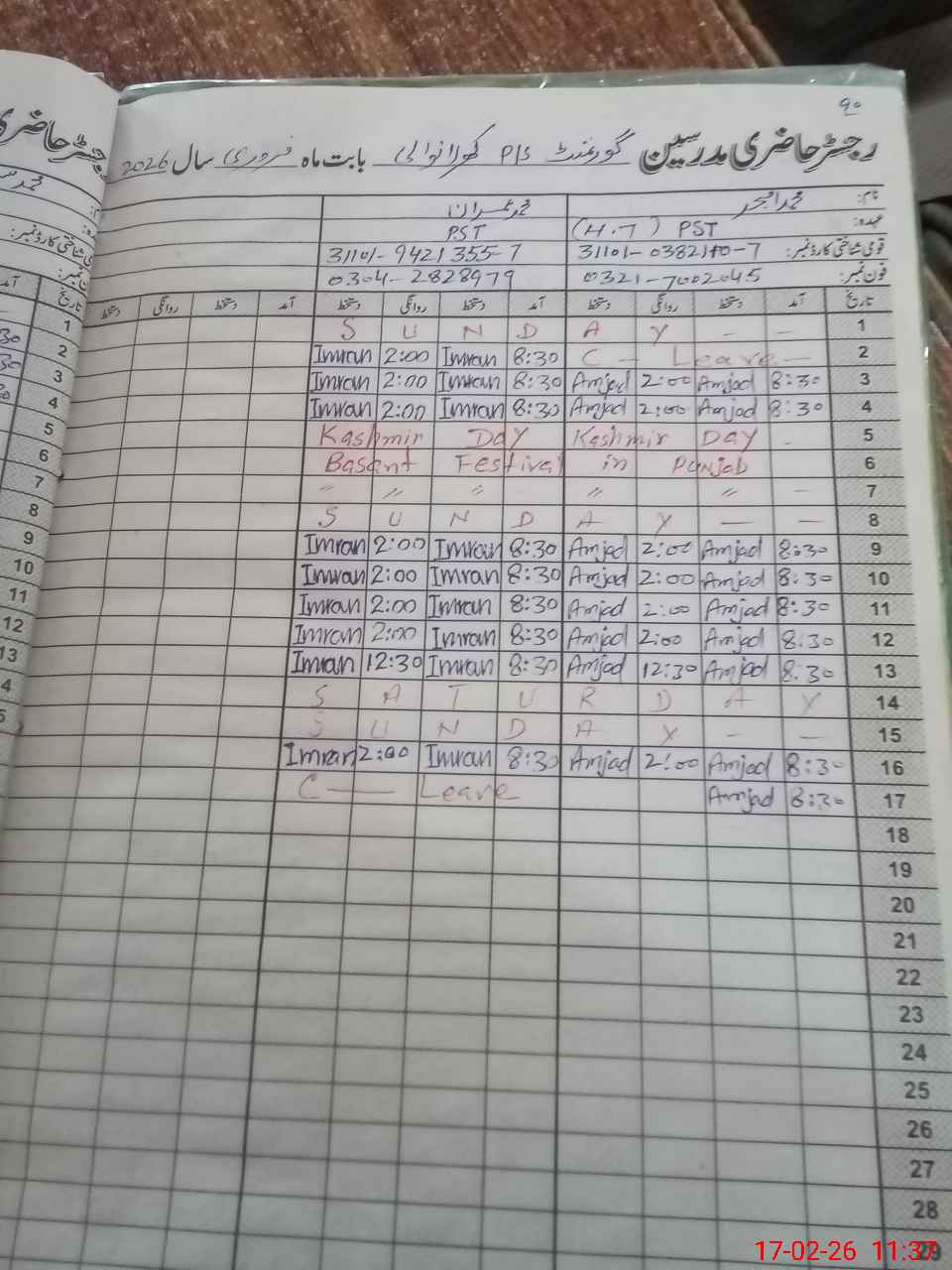 | CNIC | Full Name | Designation | R/C | Absence During Last Calender Month |