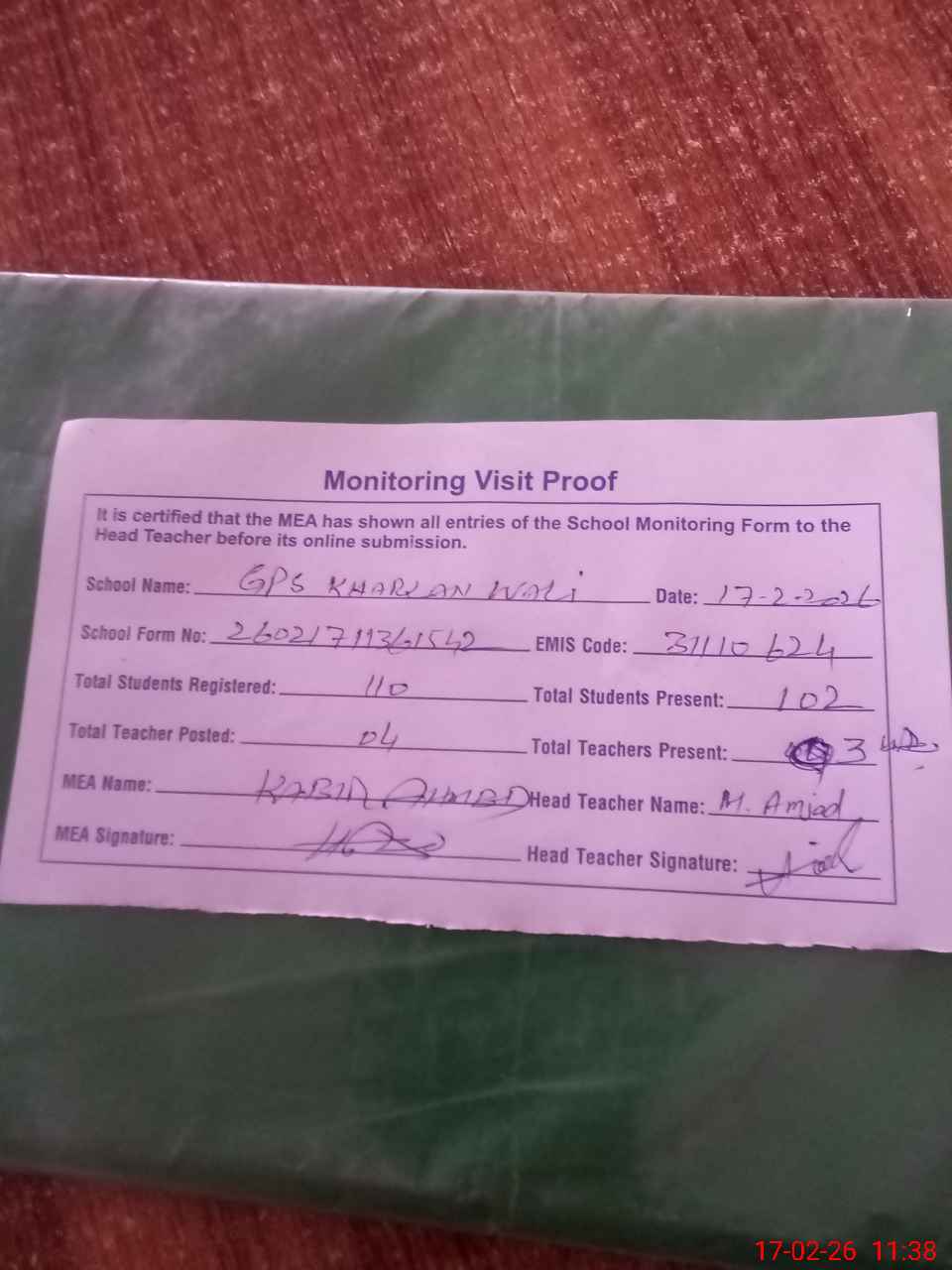 | Attendance Register | Head Teacher | MEA with School | Visit Proof |