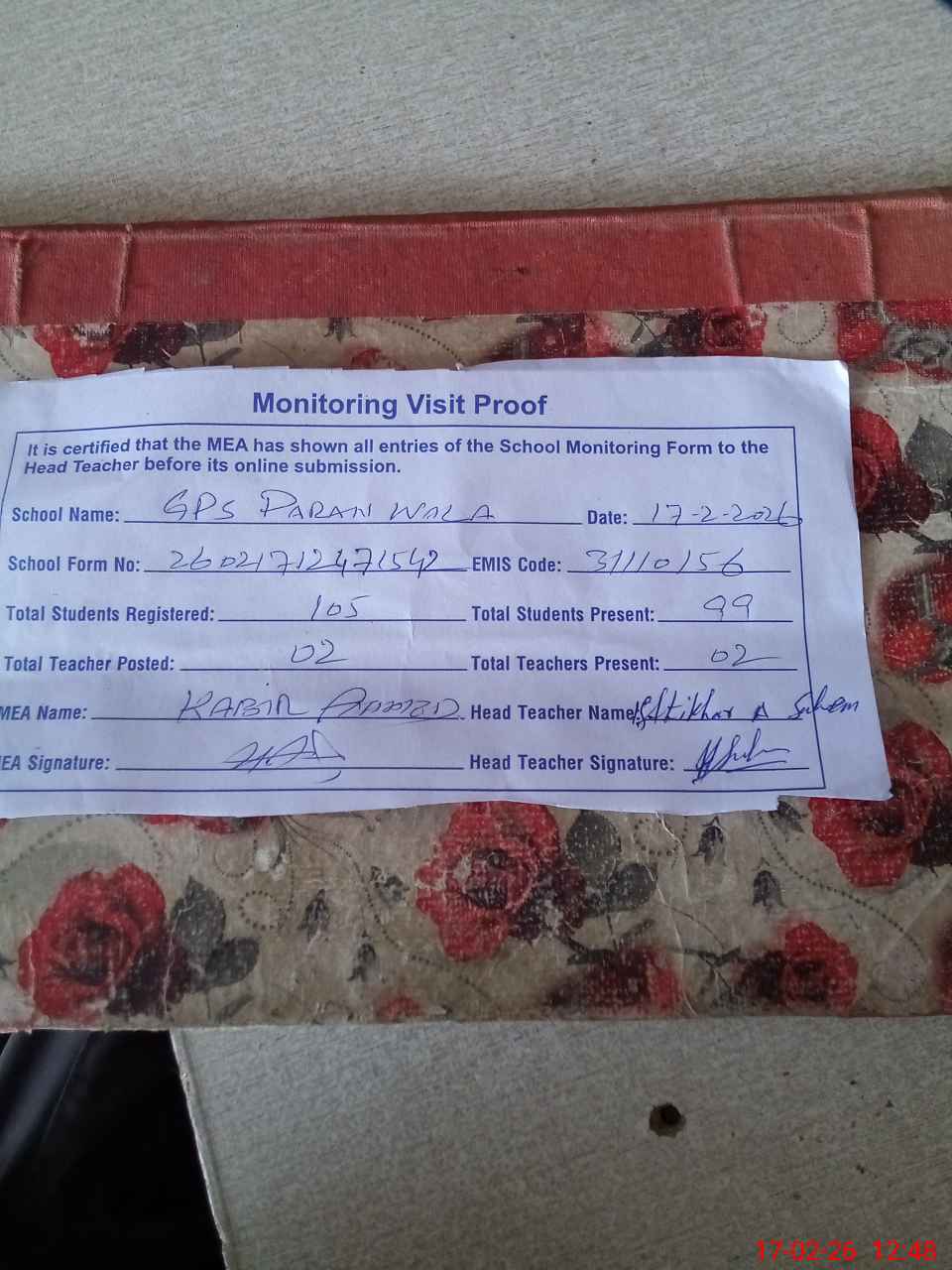 | EMIS Code: 31110156 | Name of School: GPS PARAN WALA | |||