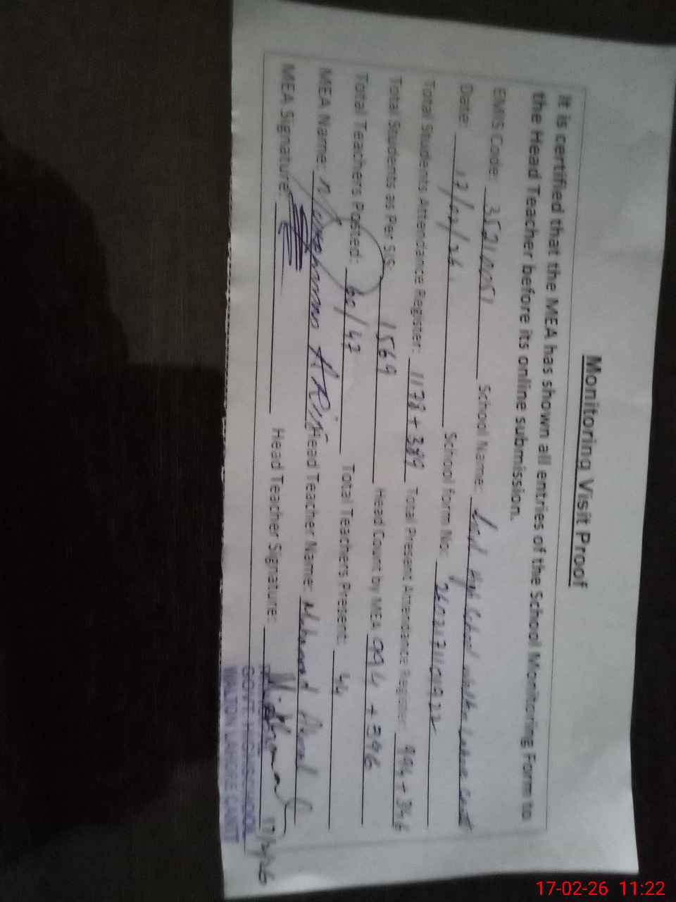 | Attendance Register | Head Teacher | MEA with School | Visit Proof |