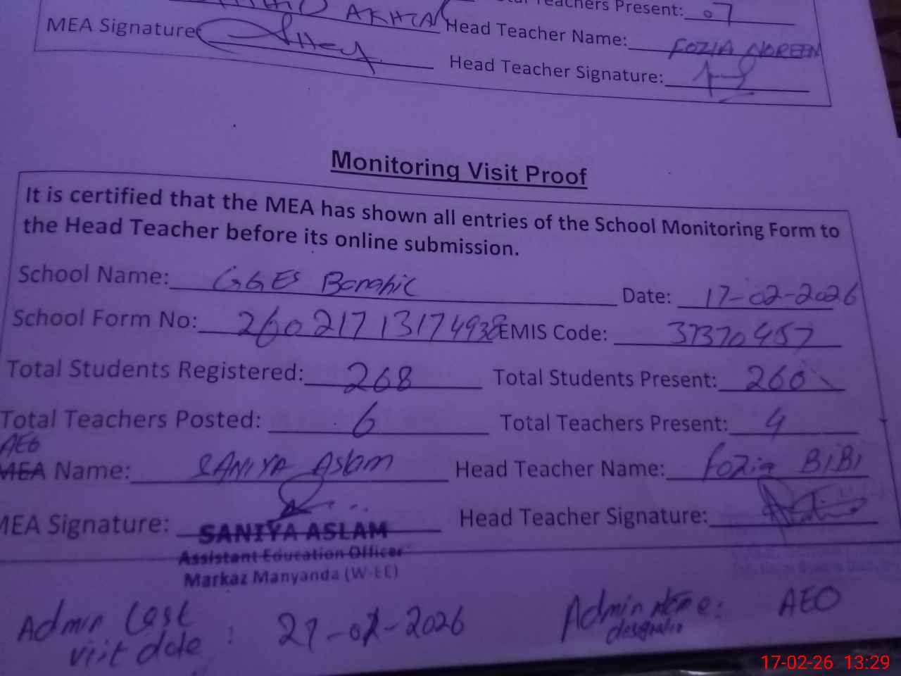 | Attendance Register | Head Teacher | MEA with School | Visit Proof |