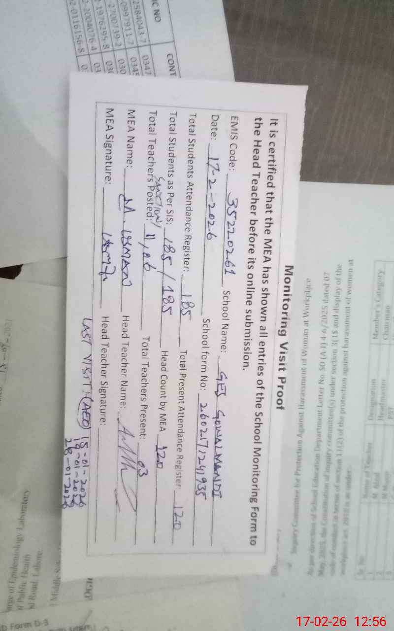 | Remarks (Use Separate Page if Required): SPECIAL OBSERVATION 05 wash rooms were non-functional due water not available. Electricity is not available due to electricity meter has cut off. water is not coming due to school meter has cut off by wapda person on 09 Feb, 2026 due to fake over Billings. Actually a filter plant is built since 10 years ago by government and funded by Hamza Shahbaz Sharif( MNA ) Also looked after by WASA lahore. Electricity meter for this filter plant against WASA on school wall and this school is no concern regarding billing of this WASA meter. Now in January, 2026 a fake electricity bill has come against this school about 257660 Rs. Actually WASA didn't pay the bill his own meter against filter plant. Head of the school put up number of applications for different authorities but still no out put and electricity is still off. | |||||