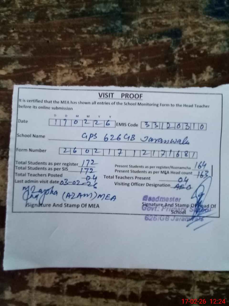 | Attendance Register | Head Teacher | MEA with School | Visit Proof |
