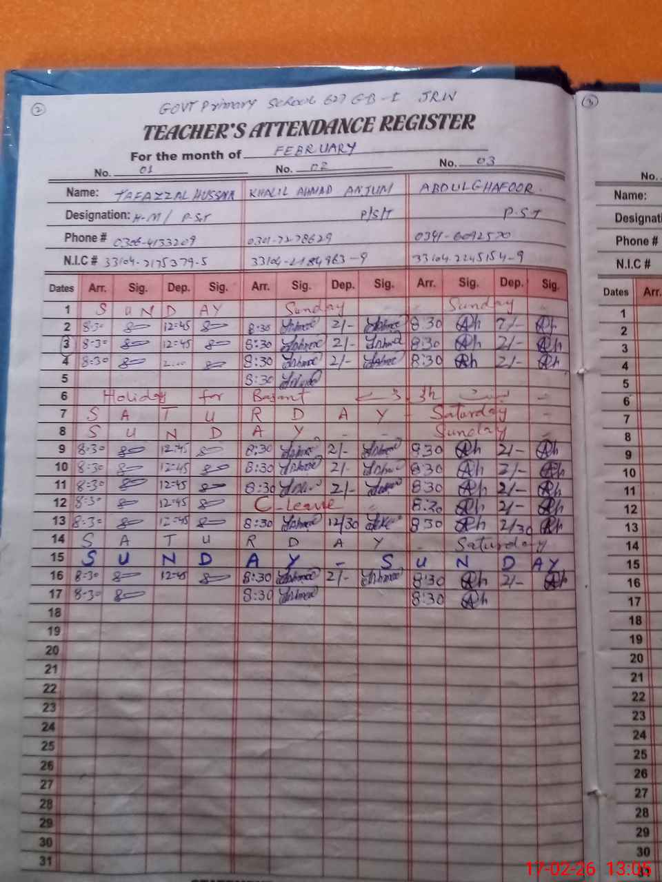 | CNIC | Full Name | Designation | R/C | Absence during last cal. month |