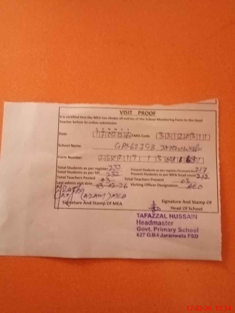 | Attendance Register | Head Teacher | MEA with School | Visit Proof |