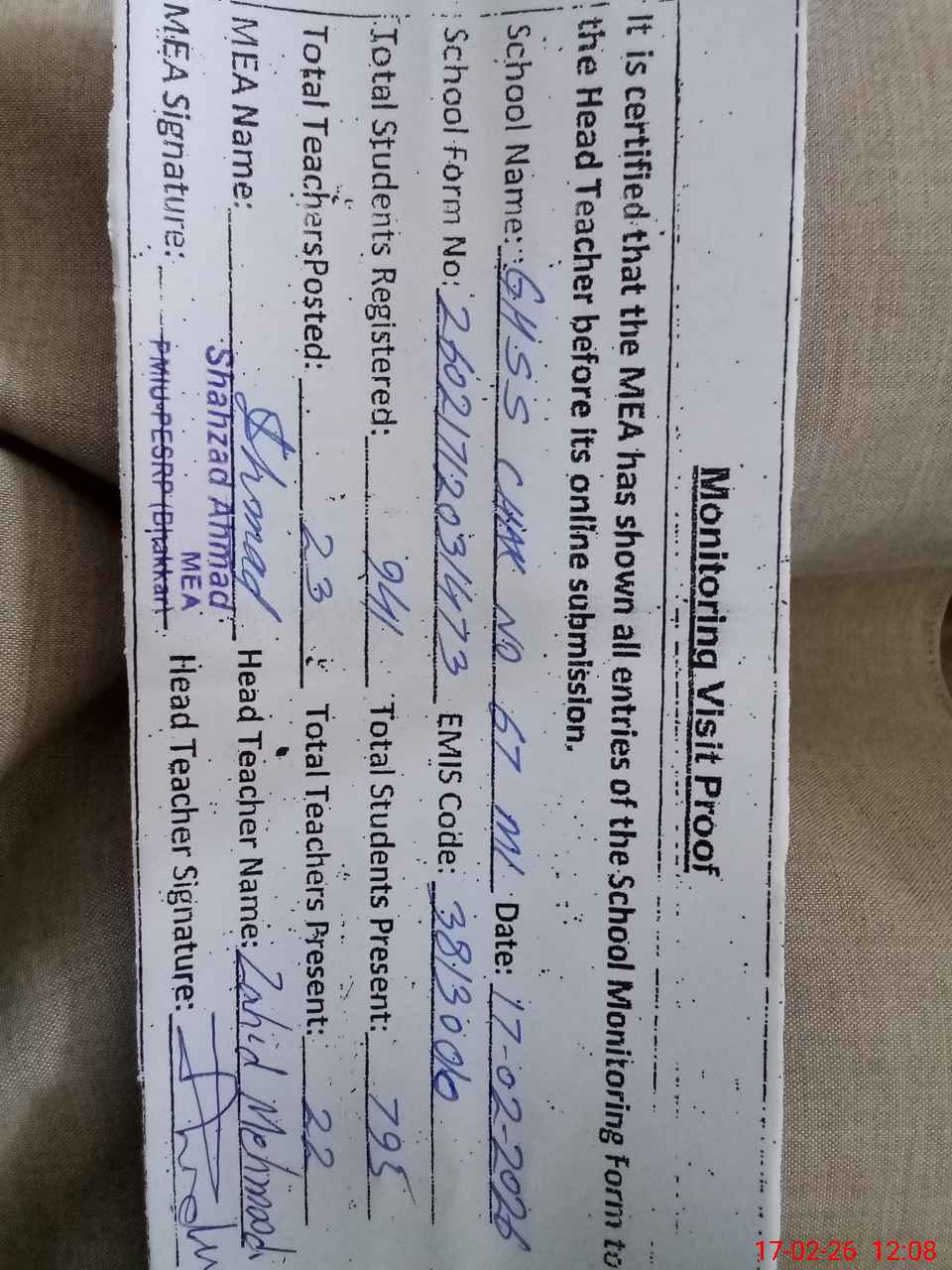 | EMIS Code: 38130010 | Name of School: GHSS CHAK NO.67/ML | |||