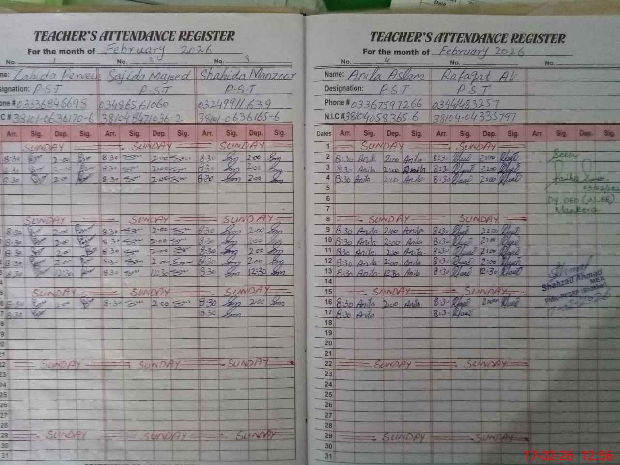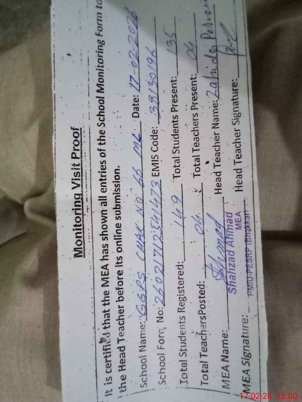 | Name: ZA**** PE**** Designation: (School Headmaster's/Headmistress's) PTC/JV Phone/Cell Number: 03**** |