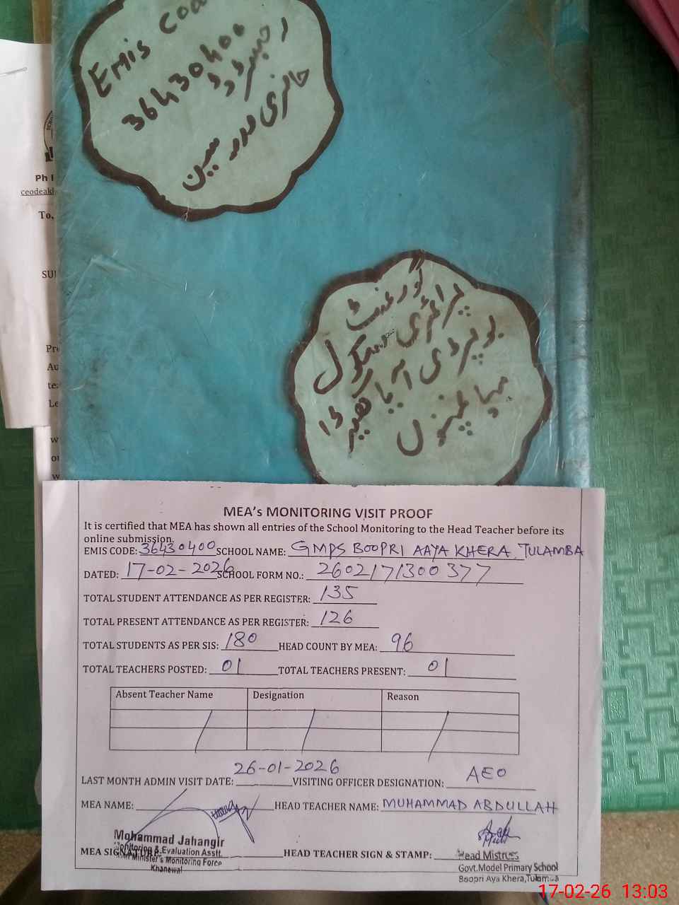 | EMIS Code: 36430400 | Name of School: GMPS BOOPRI AYA KHERA, TULAMBA | |||
