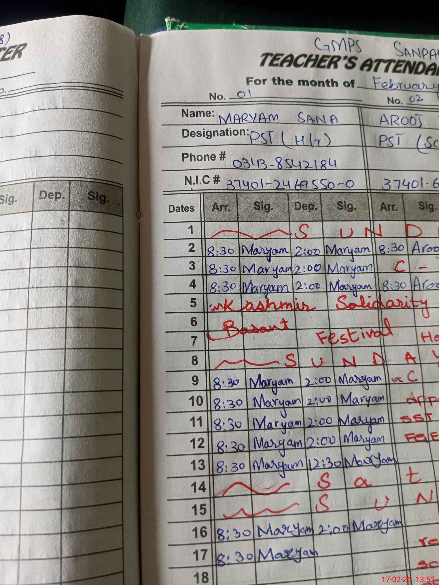 | Name: MA**** SA**** Designation: (School Headmaster's/Headmistress's) PST/PTC/JV Phone/Cell Number: 03**** |