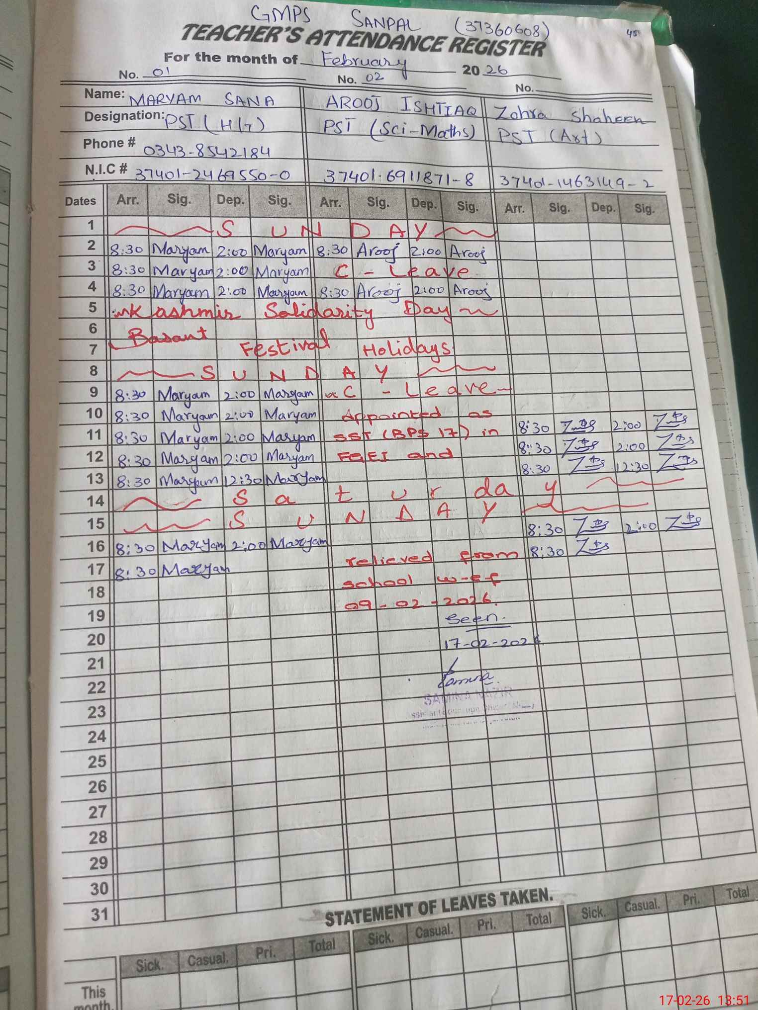 | CNIC | Full Name | Designation | R/C | Absence During Last Calender Month |