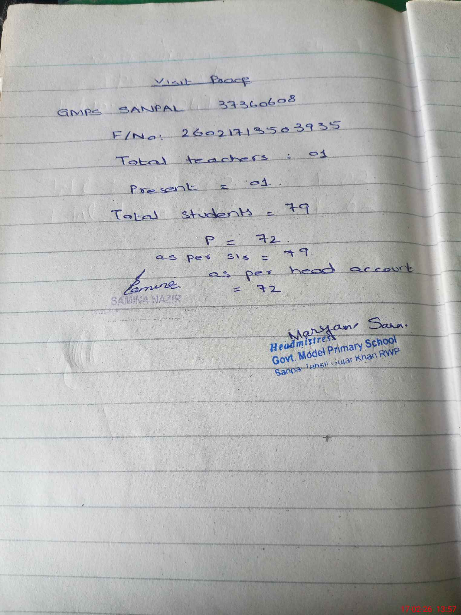 | Attendance Register | Head Teacher | MEA with School | Visit Proof |