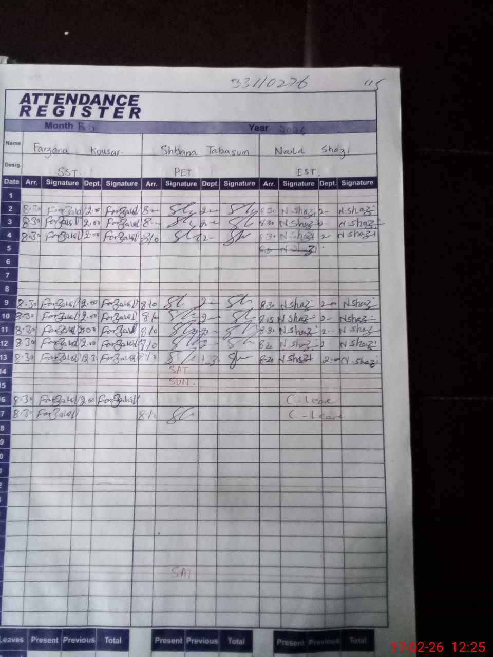 | CNIC | Full Name | Designation | R/C | Absence During Last Calender Month |