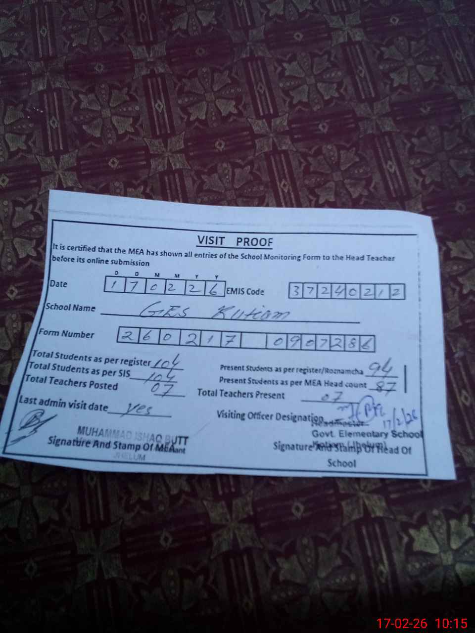 | Certified that this School was Inspected by the Undersigned MEA/DMO Today and the Information Stated Above is as Per Record. | |||||