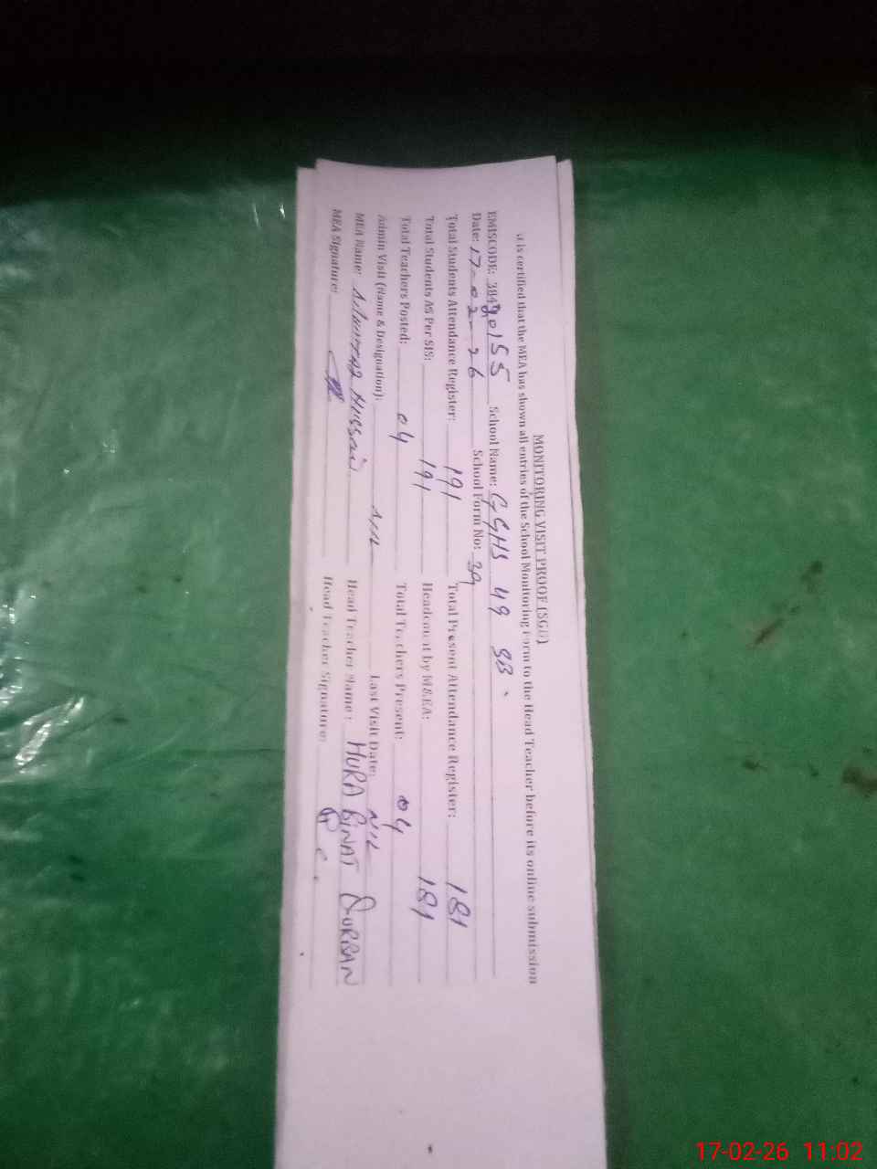 | Attendance Register | Head Teacher | MEA with School | Visit Proof |