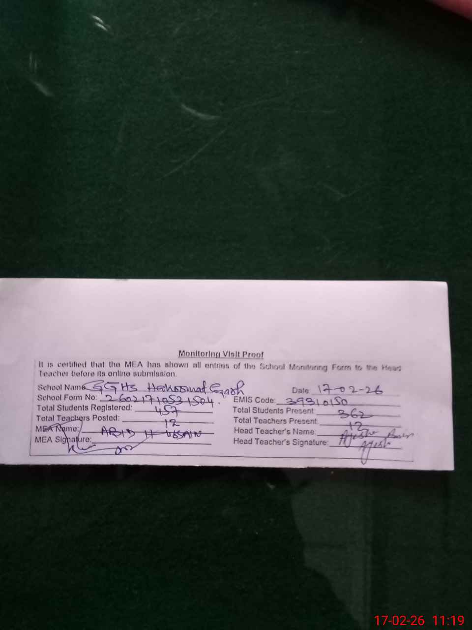 | Attendance Register | Head Teacher | MEA with School | Visit Proof |