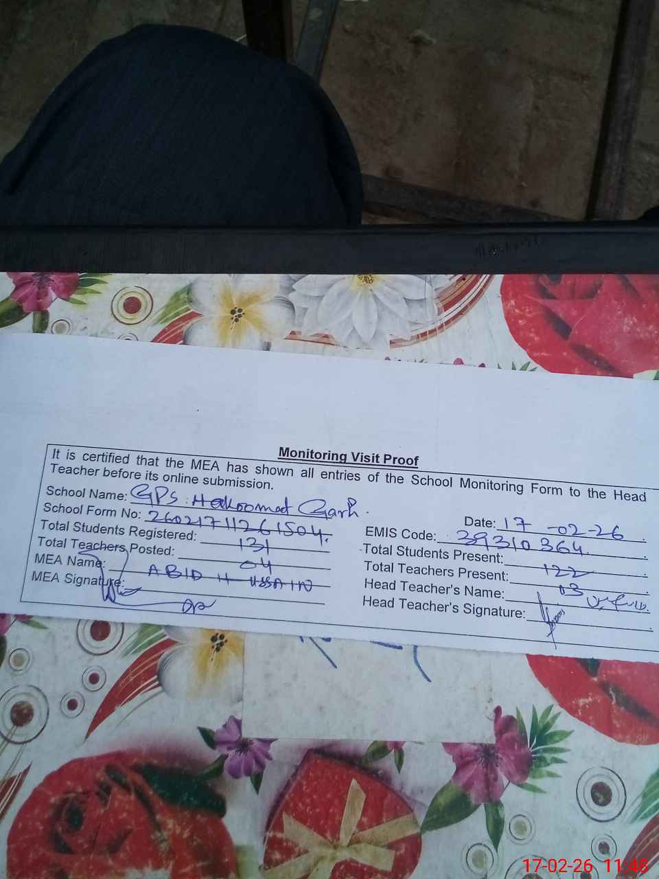 | Attendance Register | Head Teacher | MEA with School | Visit Proof |