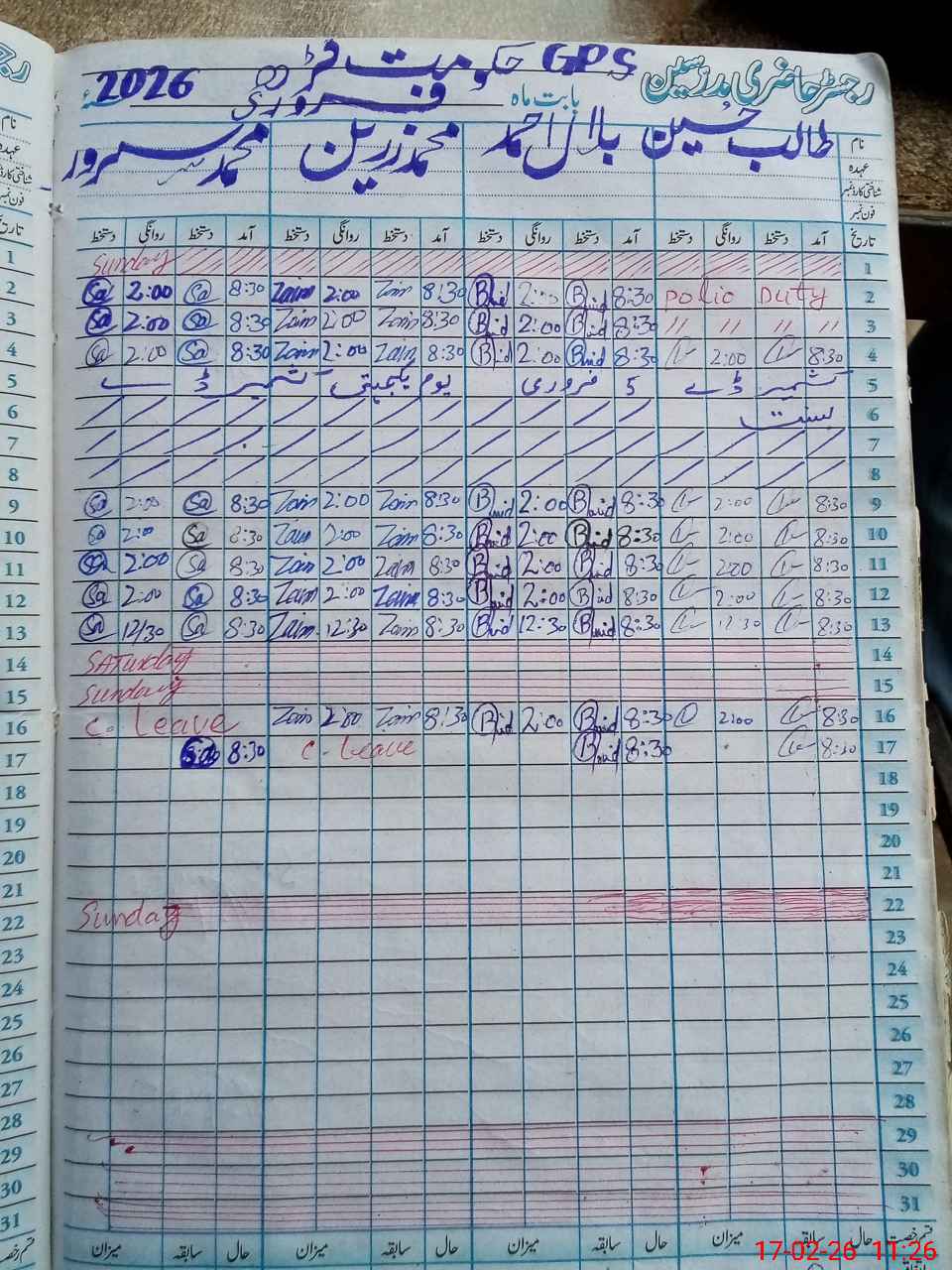 | CNIC | Full Name | Designation | R/C | Absence During Last Calender Month |
