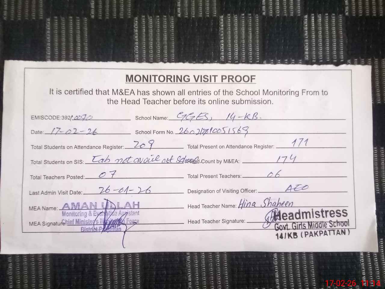 | Attendance Register | Head Teacher | MEA with School | Visit Proof |