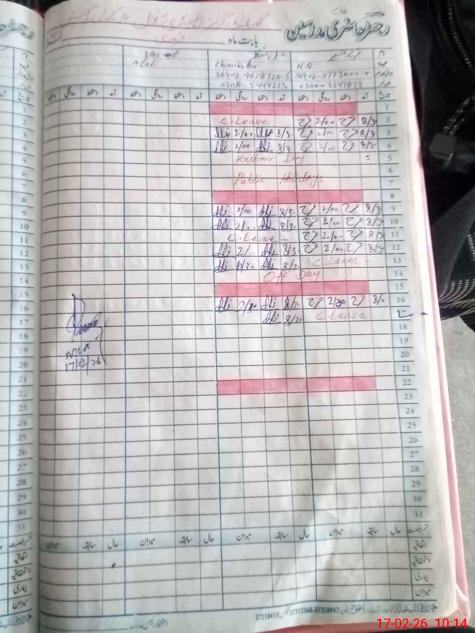 | CNIC | Full Name | Designation | R/C | Absence During Last Calender Month |