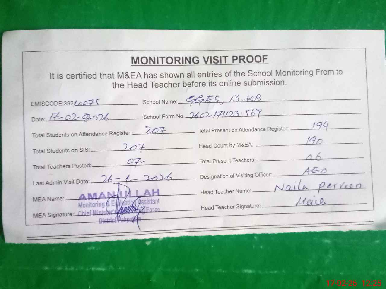 | Attendance Register | Head Teacher | MEA with School | Visit Proof |