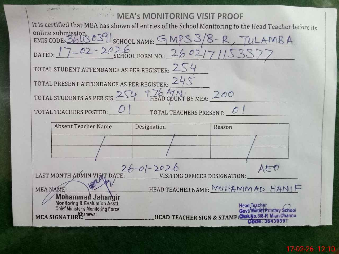 | Attendance Register | Head Teacher | MEA with School | Visit Proof |