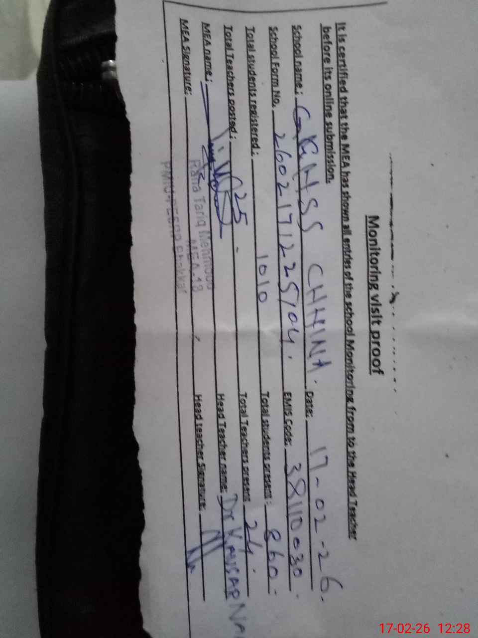 | Attendance Register | Head Teacher | MEA with School | Visit Proof |