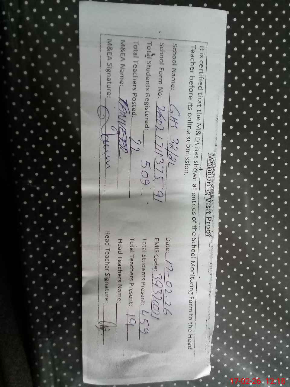 | EMIS Code: 39320021 | Name of School: GHS CHAK NO.32/2-L | |||
