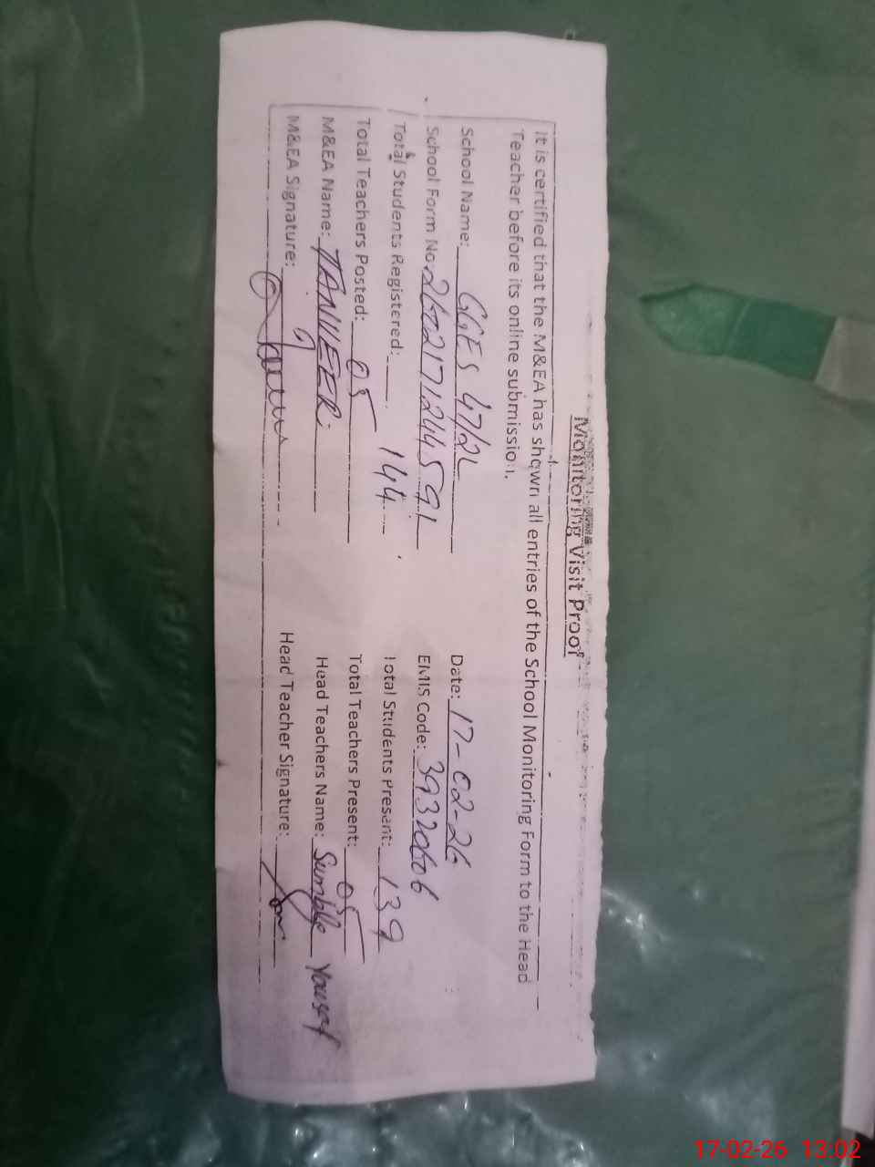 | Attendance Register | Head Teacher | MEA with School | Visit Proof |