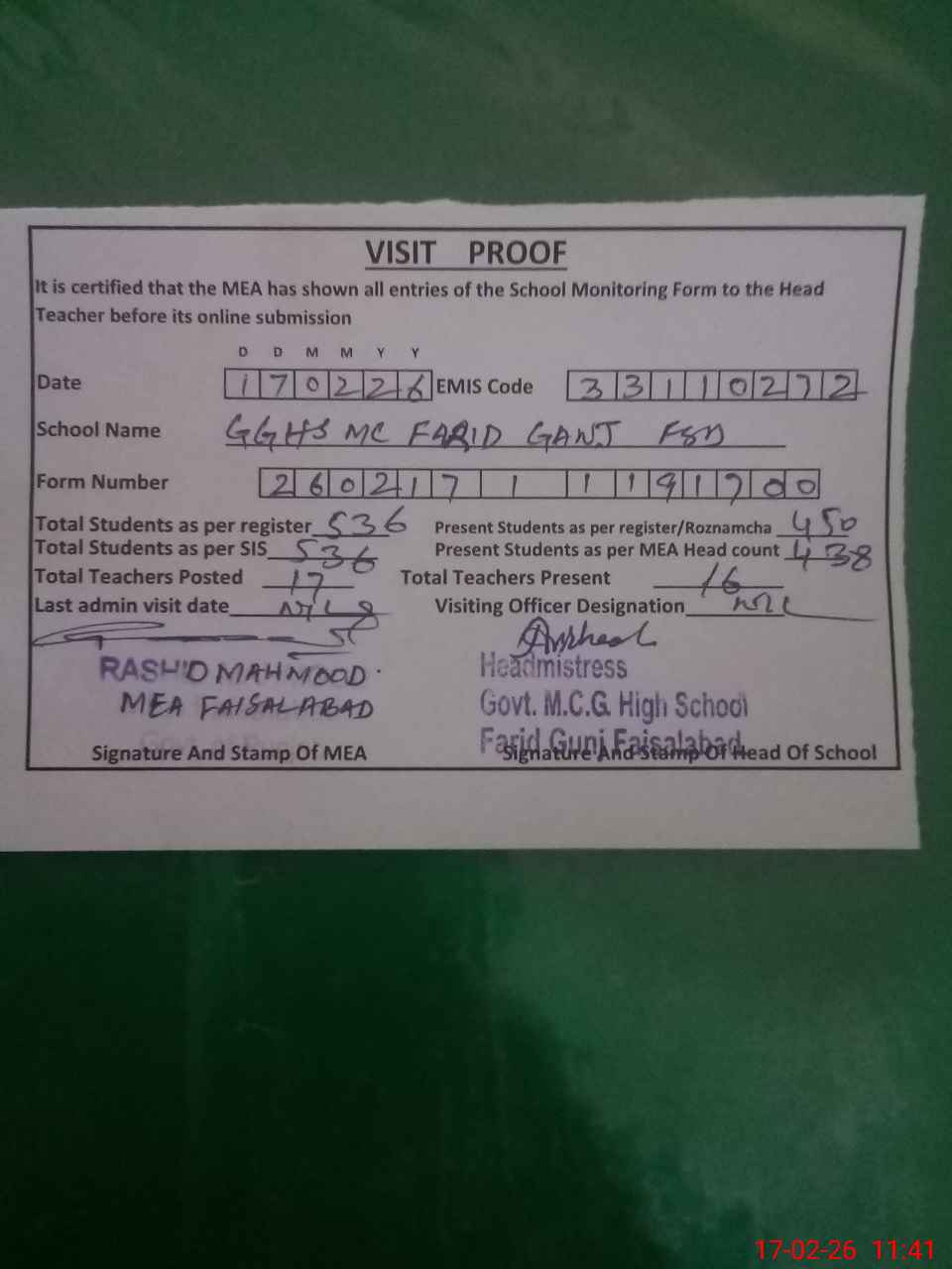 | Attendance Register | Head Teacher | MEA with School | Visit Proof |
