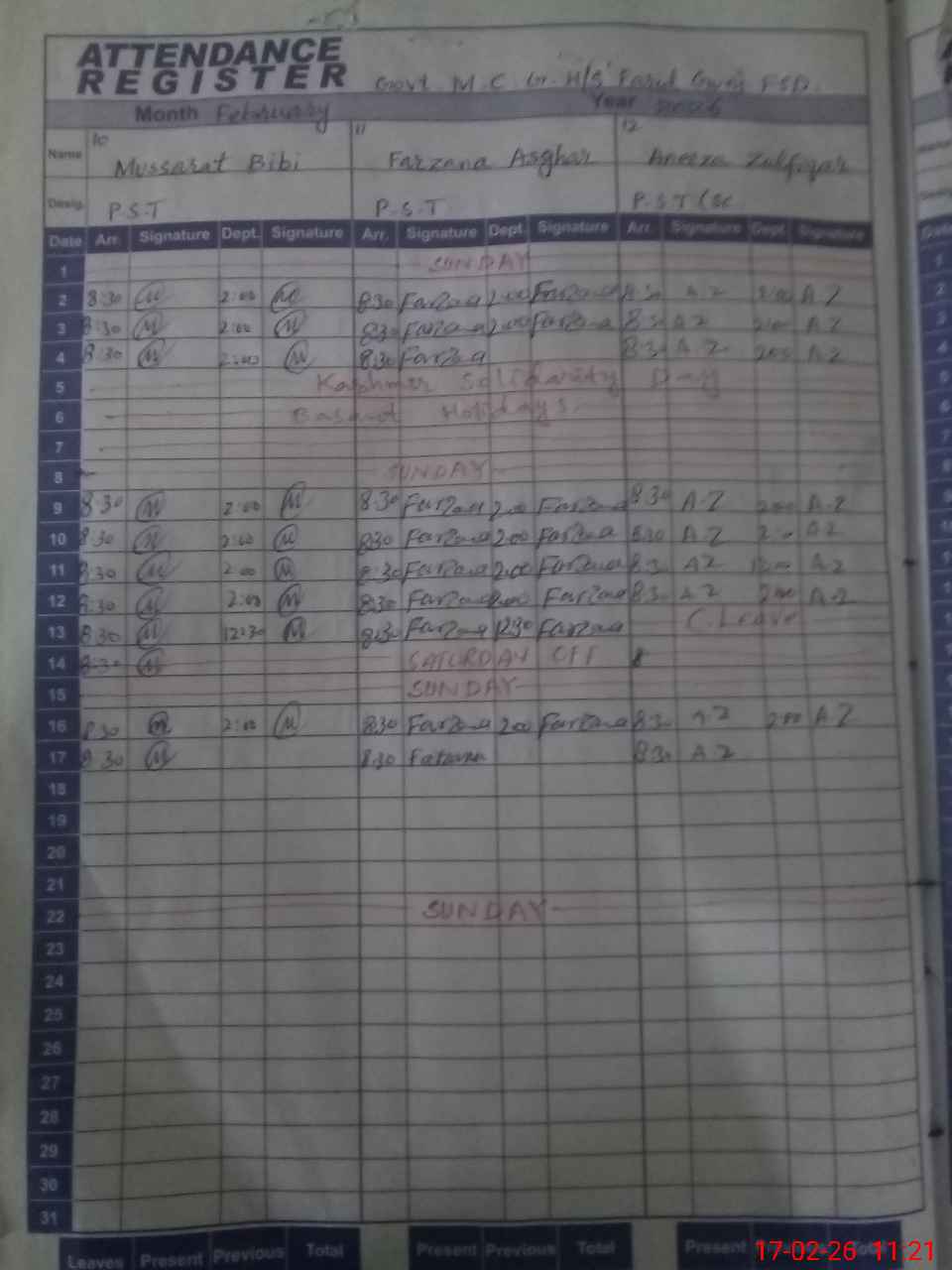 | CNIC | Full Name | Designation | R/C | Absence During Last Calender Month |