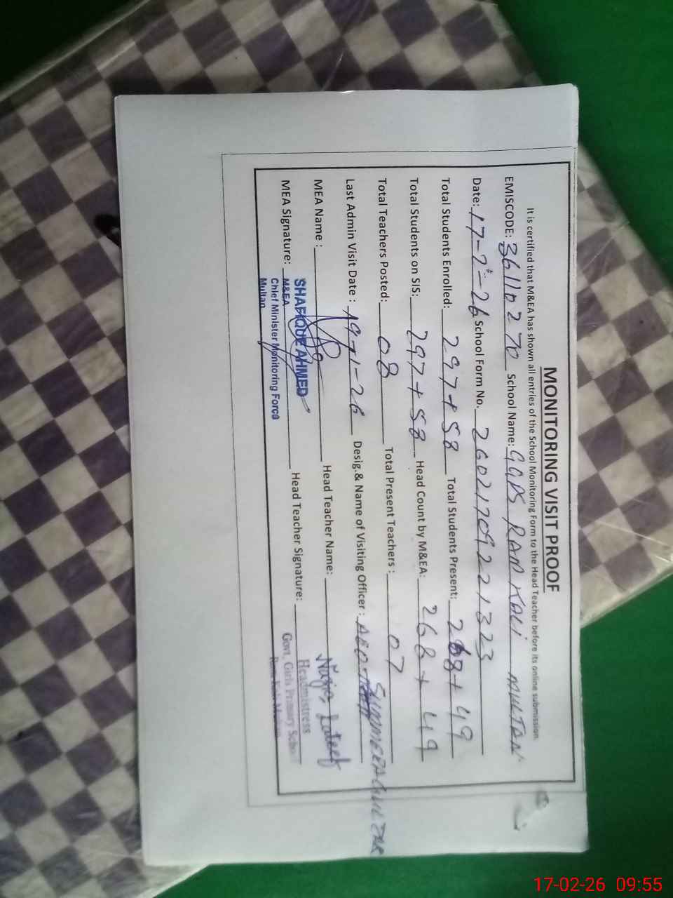| Attendance Register | Head Teacher | MEA with School | Visit Proof |
