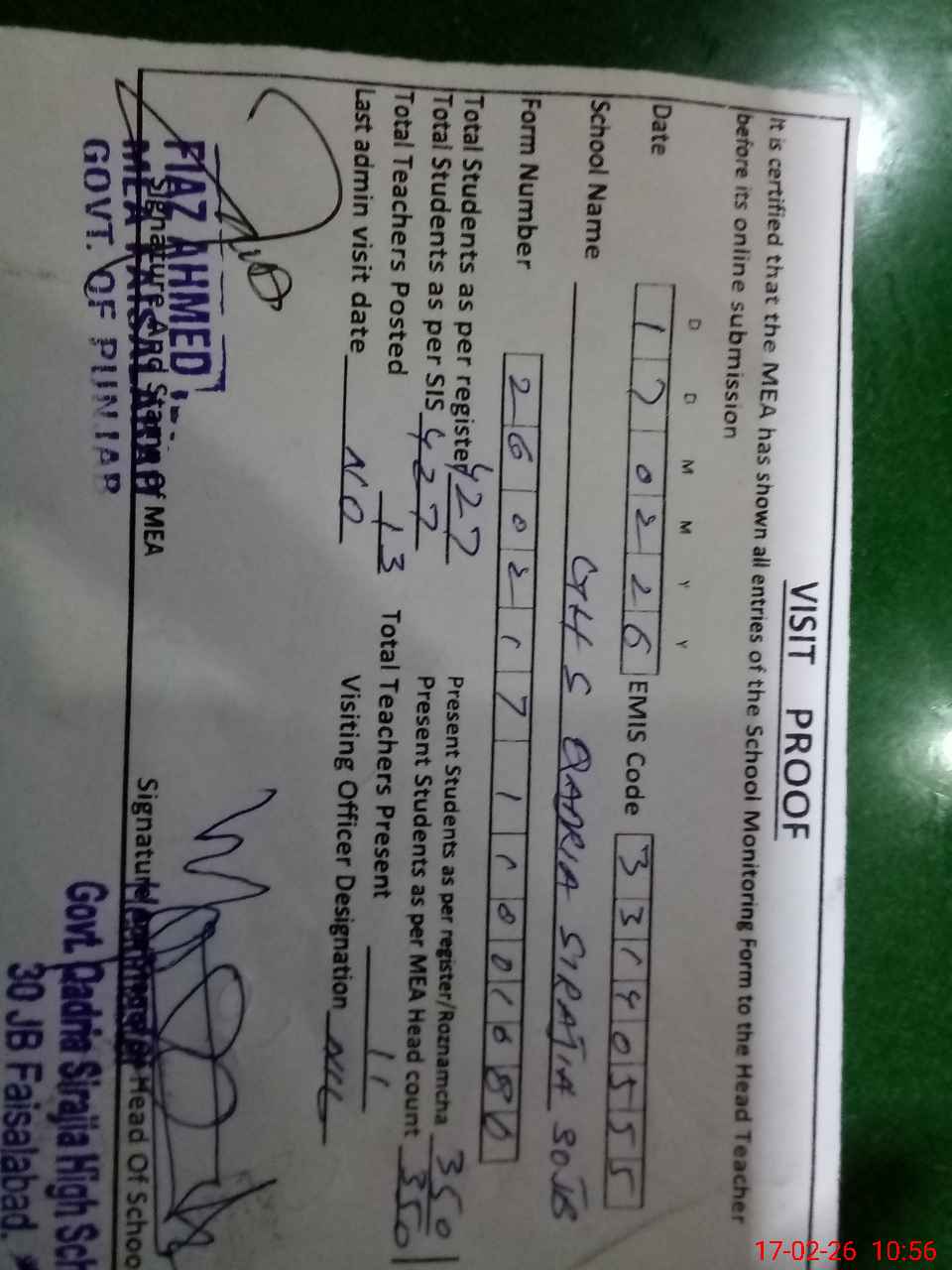| Certified that this School was Inspected by the Undersigned MEA/DMO Today and the Information Stated Above is as Per Record. | |||||
