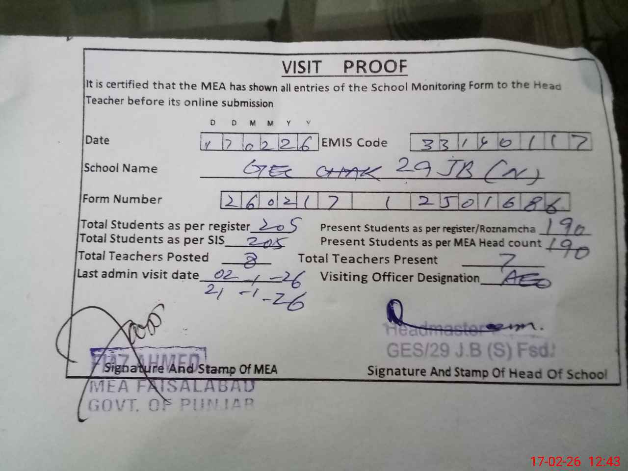 | EMIS Code: 33140117 | Name of School: GES CHAK 29 JB SOUTH | |||