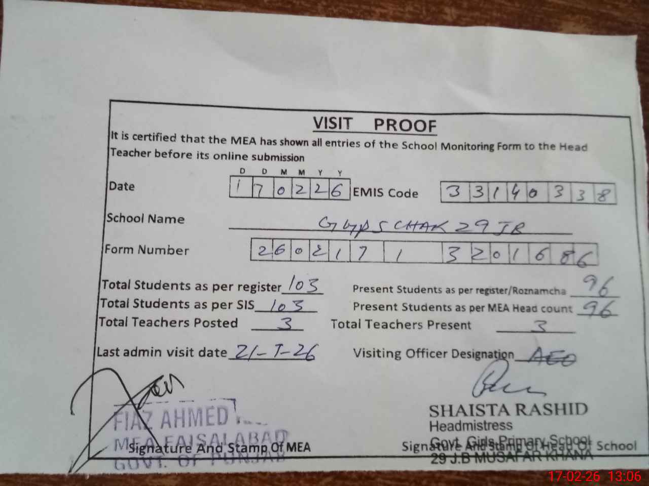 | EMIS Code: 33140338 | Name of School: GGPS CHAK 29 JB MUSAFAR KHANA | |||