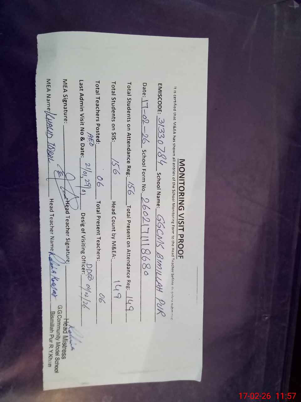 | EMIS Code: 31330784 | Name of School: GGCMS BISMILLAH PUR | |||