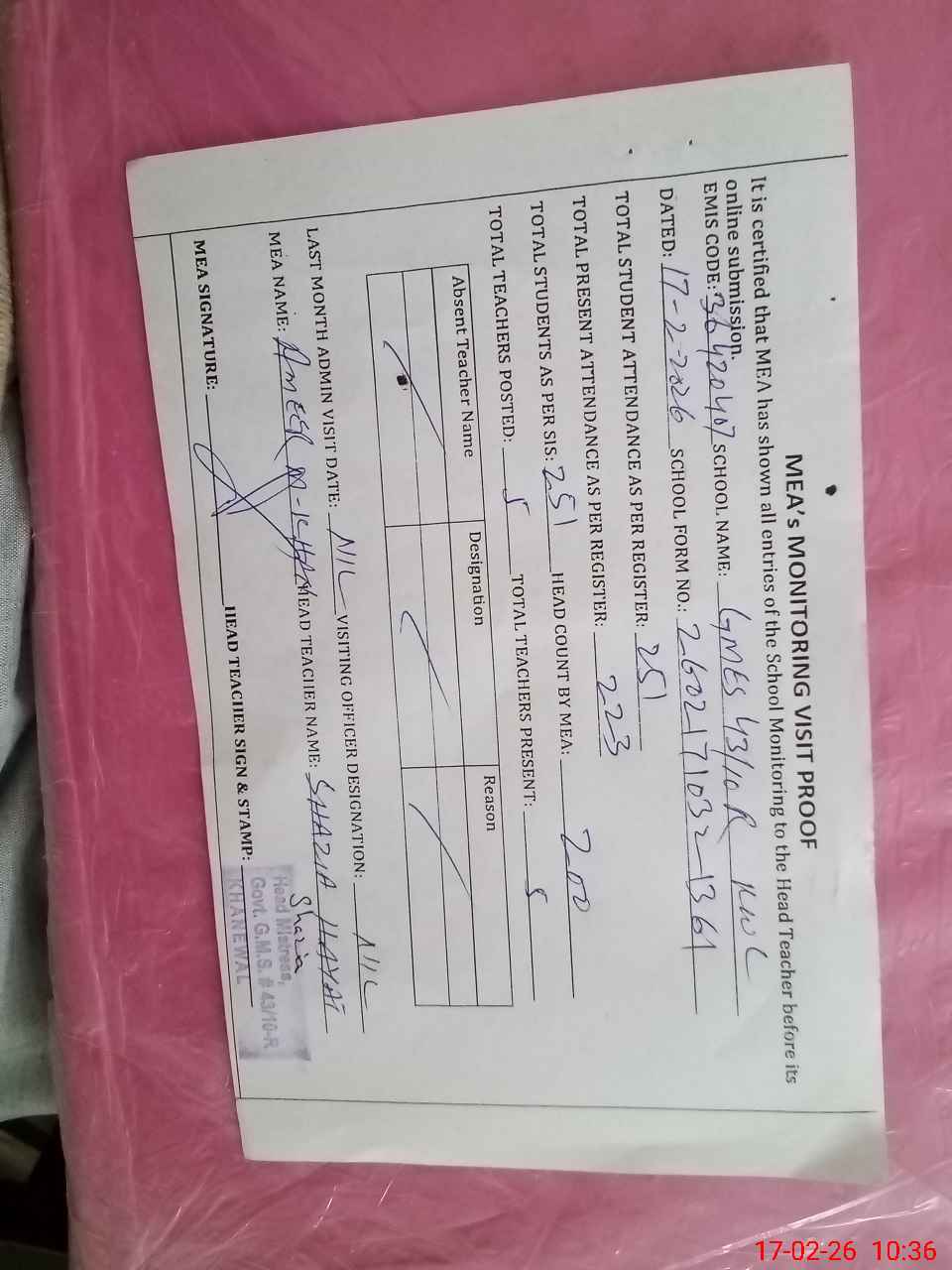 | Certified that this School was Inspected by the Undersigned MEA/DMO Today and the Information Stated Above is as Per Record. | |||||