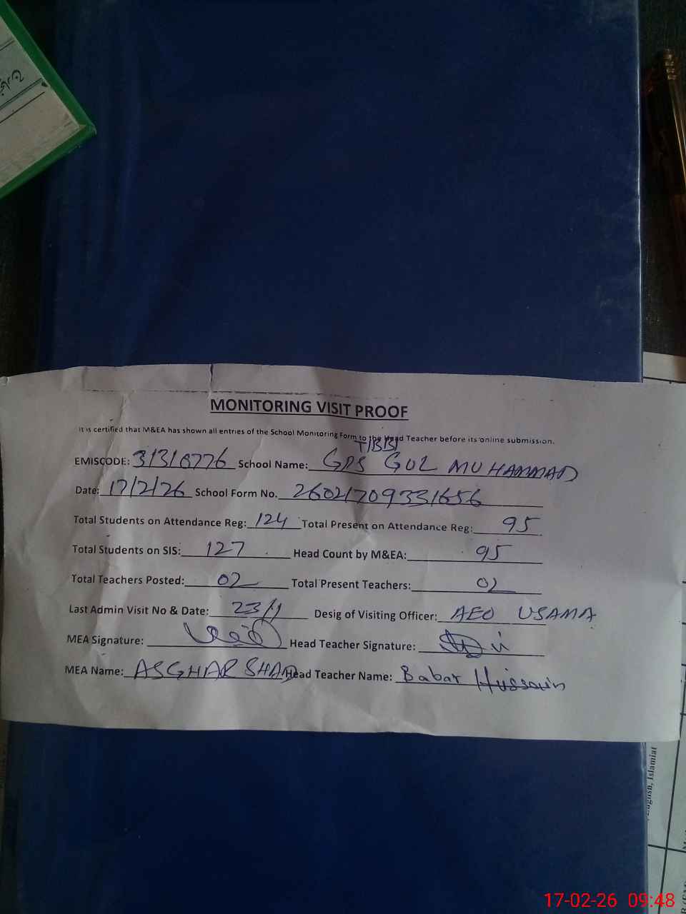 | Attendance Register | Head Teacher | MEA with School | Visit Proof |
