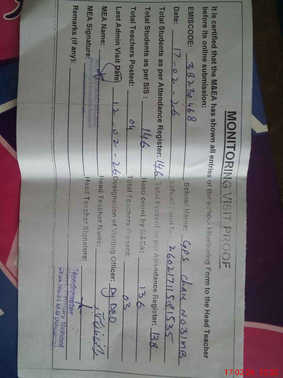 | Remarks (Use Separate Page if Required): Dy DEO visited school on 12 February 2025 students strength on sis 146 | |||||