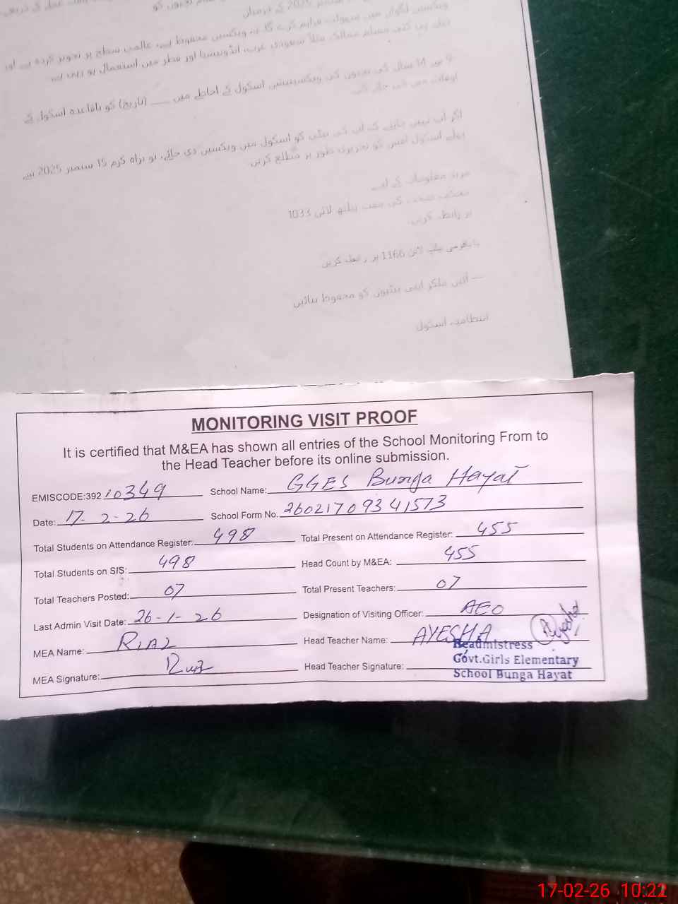 | Certified that this School was Inspected by the Undersigned MEA/DMO Today and the Information Stated Above is as Per Record. | |||||