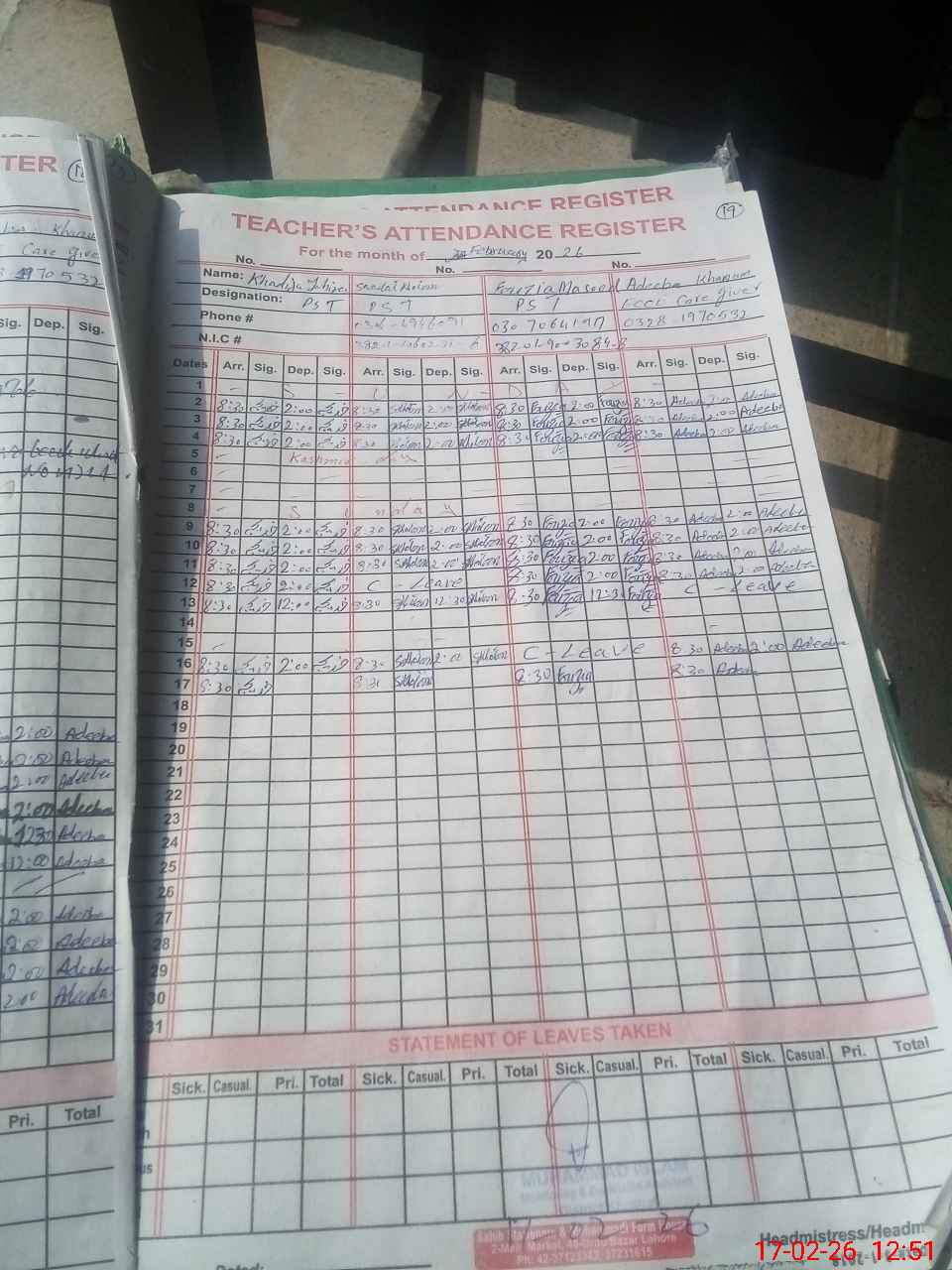 | Name: Kh**** Ta**** Designation: (School Headmaster's/Headmistress's) PST/PTC/JV Phone/Cell Number: 03**** |