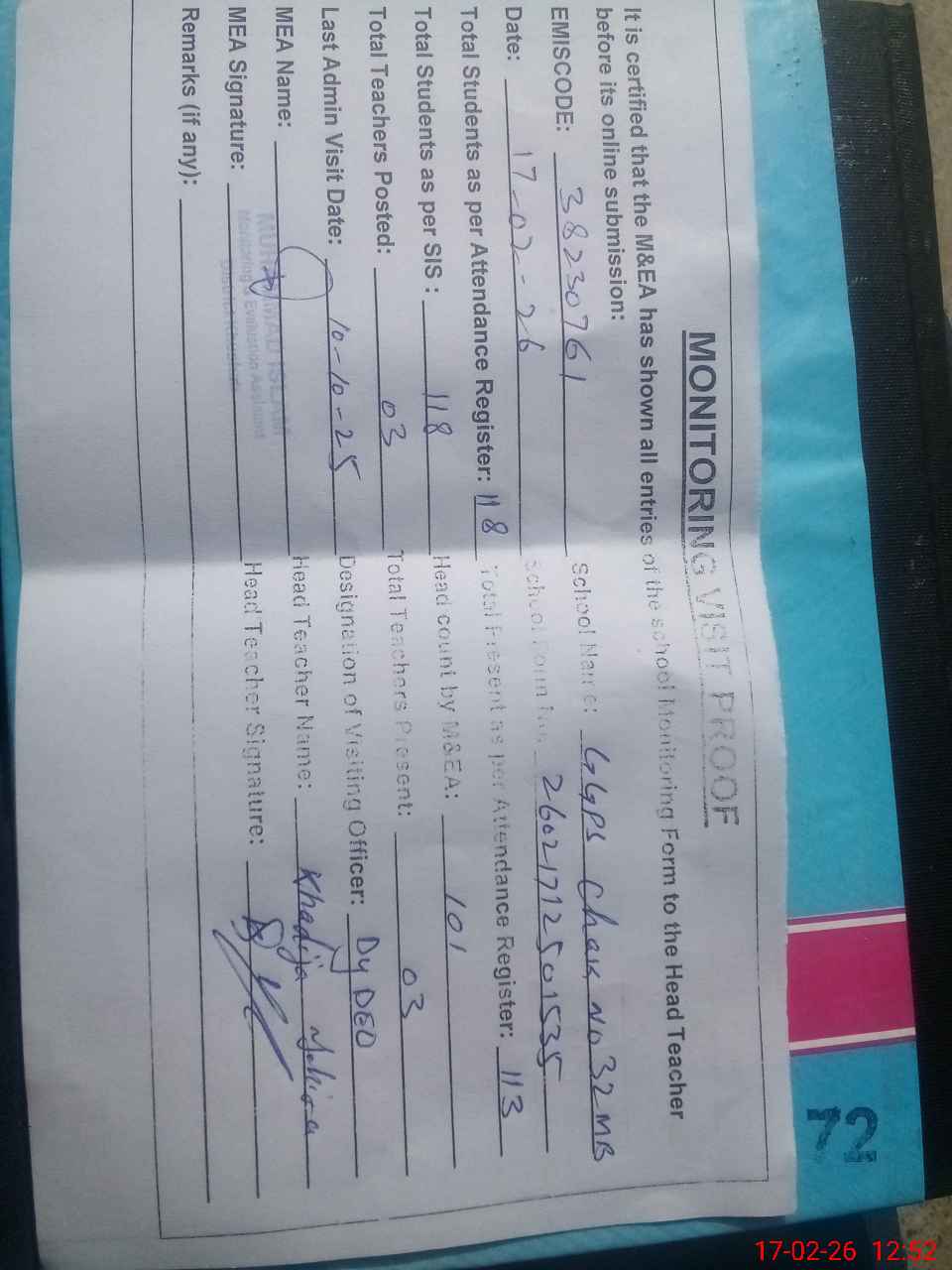 | Remarks (Use Separate Page if Required): Dy DEO visited school on 10 October 2025 students strength on sis 118 | |||||